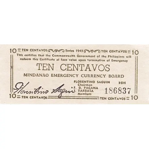 | Obverse lettering | TEN CENTAVOS SERIES 1943 TEN CENTAVOS THIS CERTIFIES THAT THE COMMONWEALTH GOVERNMENT OF THE PHILIPPINES WILL REDEEM THIS CERTIFICATE AT FACE VALUE UPON TERMINATION OF EMERGENCY TEN CENTAVOS MINDANAO EMERGENCY CURRENCY BOARD TEN CENTAVOS TEN CENTAVOS |