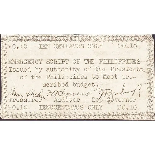 | Obverse lettering | TEN CENTAVOS ONLY EMERGENCY SCRIPT OF THE PHILIPPINES ISSUED BY AUTHORITY OF THE PRESIDENT OF THE PHILIPPINES TO MEET PRESCRIBED BUDGET TEN CENTAVOS ONLY |