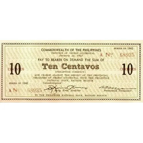 | Chữ khắc mặt trước | COMMONWEALTH OF THE PHILIPPINES PROVINCE OF NEGROS OCCIDENTAL JANUARY 13, 1942 PAY TO BEARER ON DEMAND THE SUM OF TEN CENTAVOS (PHILIPPINE CURRENCY) AND CHANGE AGAINST THE DEPOSIT OF PROVINCIAL TREASURER OF NEGROS OCCIDENTAL WITH THE PHILIPPINE NATIONAL BANK, BACOLOD BRANCH TO THE PHILIPPINE NATIONAL BANK, BACOLOD BRANCH |