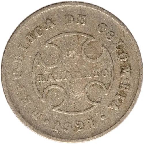 | نوشتههای روی توکن | REPUBLICA DE COLOMBIA LAZARETO 1921 (Translation: Republic of Colombia Leper Colonies 1921) |