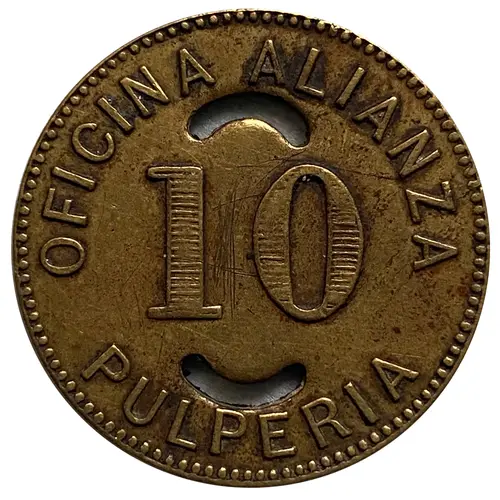 | Obverse lettering | Oficina Alianza 10 Centavos Pulperia (Translation: Alianza Office 10 Cents Grocers shop) |