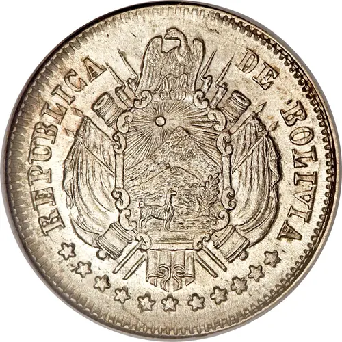 | Obverse description | Bolivian arms, country name as curved legend on sides, 11 5-pointed stars below |