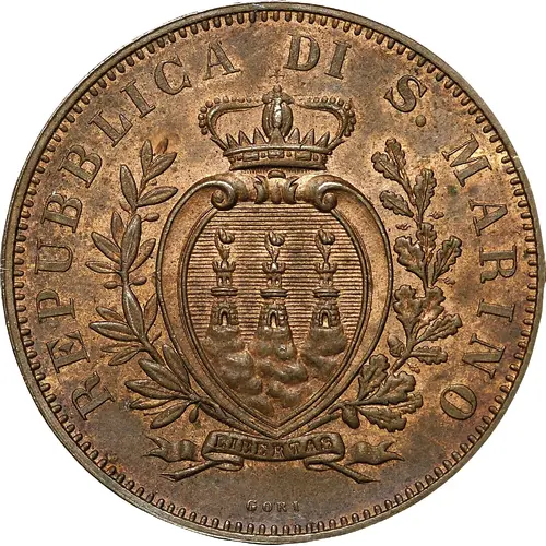 Obverse description Coat of arms of San Marino with the three towers surrounded by an olive branch (or laurel) and one of oak. At the top, crown, symbol of the sovereignty of San Marino. Below, cartouche bearing incused LIBERTAS and indication of the author GORI. Around REPUBBLICA DI S. MARINO.