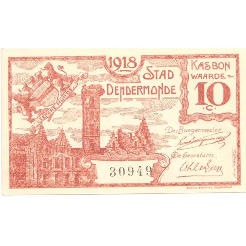 | Obverse lettering | 1918 STAD DENDERMONDE KASBON WAARDE 10 c |