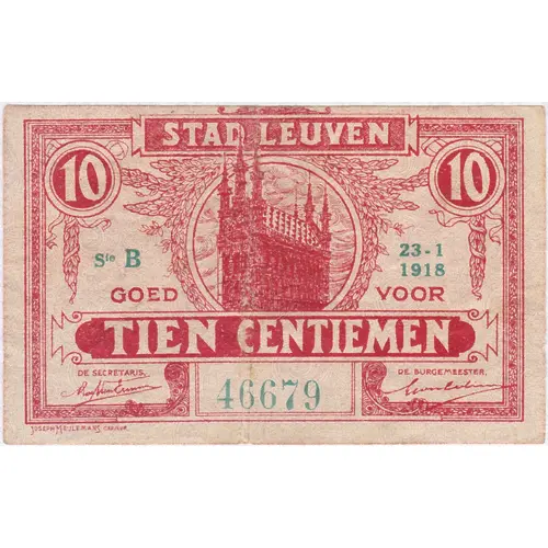 | 表面の銘文 | STAD LEUVEN 10 10 Sie B 23-1 1918 GOED VOOR TIEN CENTIEMEN DE SECRETARIS, 46679 DE BURGEMEESTER, (signature) (signature) JOSEPH MEULEMANS, GRAVEUR (Translation: Ville de Louvain Série B Bon pour 10 centimes Le Secrétaire, le Bourgmestre,) |
