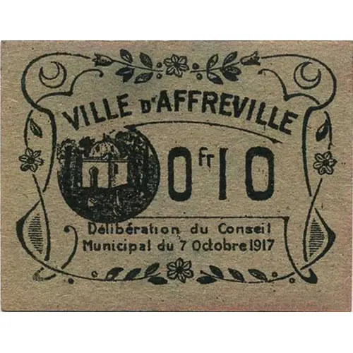 | Chữ khắc mặt trước | VILLE d`AFFREVILLE 0 fr 10 Deliberation du Conseil Municipal du 7 Octobre 1917 |