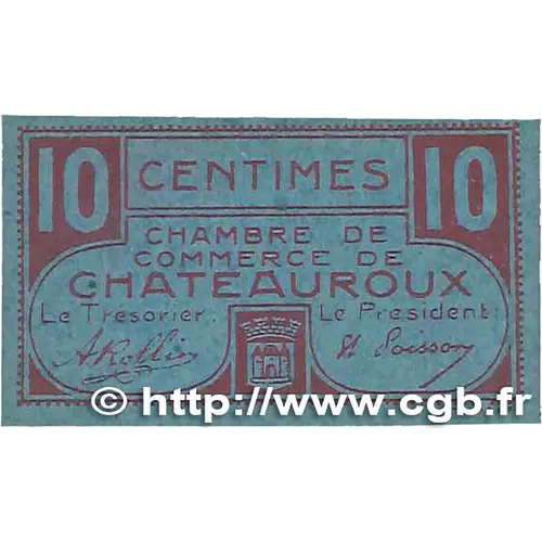 | Obverse lettering | 10 CENTIMES CHAMBRE DE COMMERCE DE CHATEAUROUX Le Trésorier Le Président LITH BADEL |