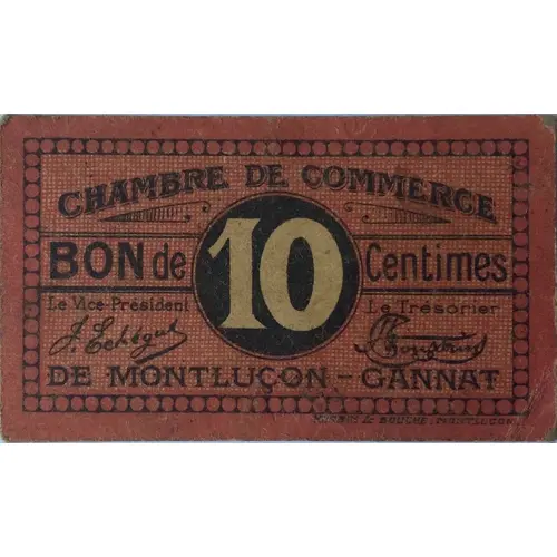 | Vorderseitenlegende | CHAMBRE DE COMMERCE BON de 10 Centimes Le Vice-Président Le Trésorier DE MONTLUCON - GANNAT HERBIN & BOUCHE . MONTLUCON |