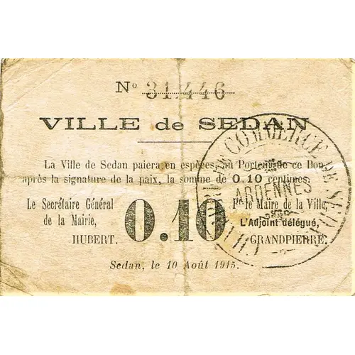 | Legenda del dritto | N° 31446 VILLE DE SEDAN La Ville de Sedan paiera en espèces, au porteur de ce Bon après la signature de la Paix, la somme de 0,10 centimes. Le Secrétaire général de la Mairie, HUBERT. Pr le Maire de la Ville L`Adjoint délégué GRANDPIERRE. 0,10 Sedan le 10 Août 1915. |