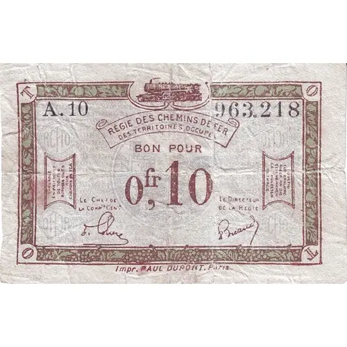 REGIE DES CHEMINS DE FER DES TERRITOIRES OCCUPES BON POUR 0fr,10 RCFTO | OTFCR VALABLE EN PAIEMENT DE TOUTES SOMMES DUES AUX CHEMINS DE FER OUTLIG ZUR ZAMLUNG ALLER AN DIE EISENBAHNTEN GESCHULDETEN BETRACE RCFTO | OTFCR Impr. PAUL DUPONT. PARIS |