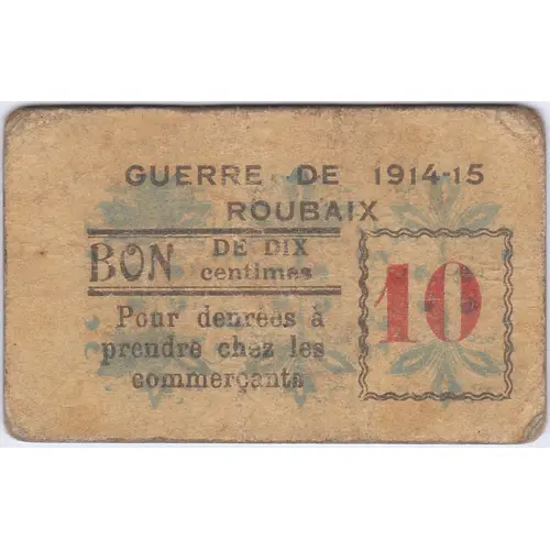 GUERRE DE 1914-15 ROUBAIX (ligne) BON DE DIX centimes (ligne) Pour denrées à prendre chez les commerçants 10 |