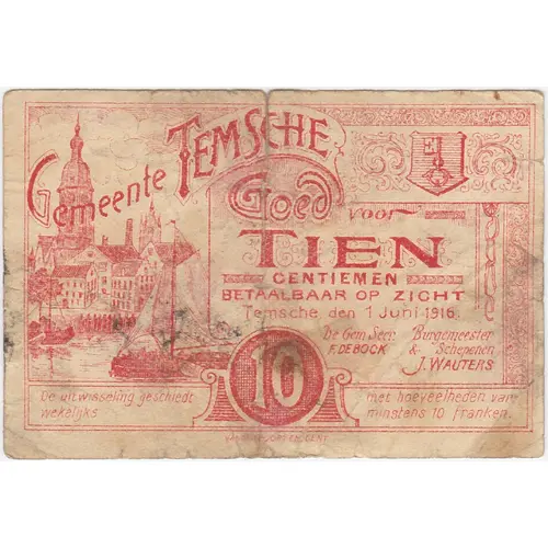 GEMEENTE TEMSCHE Goed voor TIEN CENTIEMEN BETAALBAAR OP ZICHT TEMSCHE, DEN 1 JUNI 1916 De Gem. Secr. Burgemeester & Schepenen F. DE BOCK J. WAUTERS De uitwisseling geschiedt met hoevelheden van wekelijks minstens 10 franken. (Translation: Commune de Temsche Bon pour dix centimes payables à vue Temsche, le 1er juin 1916 Le Secrétaire communal Le Bourgmestre et les Echevins L`échange s`effectue avec des montants d`au moins 10 francs par semaine.) |