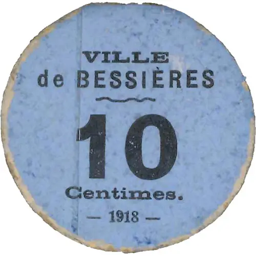 | Obverse lettering | VILLE DE BESSIÈRES 10 Centimes. - 1918 - |
