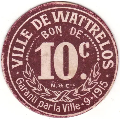 | Obverse lettering | VILLE DE WATTRELOS BON DE 10c. N & Cie Garanti par la Ville · 9 · 1915 |