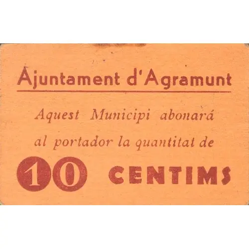 Ajuntament d`Agramunt Aquest Municipi abonará al portador la quantitat de 10 CENTIMS (Translation: City Council of Agramunt This Municipality will pay the bearer the amount of 10 Centimos) |