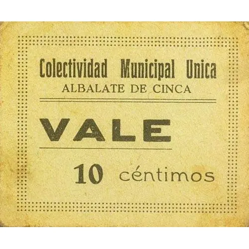 Obverse lettering Colectividad Municipal Unica ALBALATE DE CINCA VALE 10 céntimos