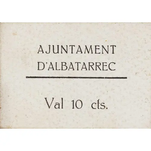 AJUNTAMENT D`ALBATARREC Val 10 cts. (Translation: City Council of Albatàrrec It`s worth 10 Centimos) |