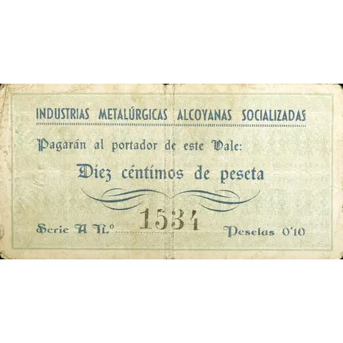 INDUSTRIAS METALÚRGICAS ALCOYANAS SOCIALIZADAS Pagarán al portador de este Vale: Diez céntimos de peseta Serie A Pesetas 0`10 (Translation: Socialized Alcoyan Metallurgical Industries They will pay the bearer of this Voucher: Ten Centimos of Peseta) |