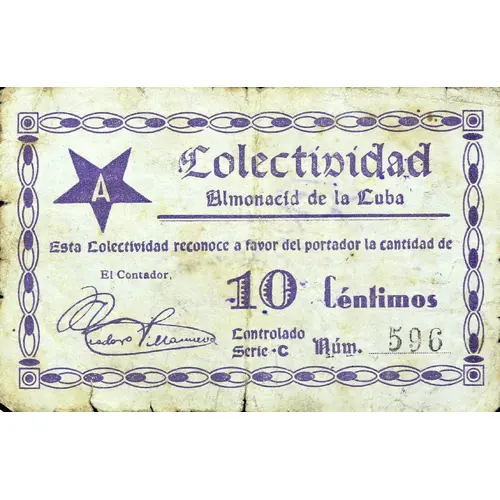 Colectividad Almonacid de la Cuba Esta Colectividad reconoce a favor del portador la cantidad de 10 Céntimos (Translation: Collectivity Almonacid de la Cuba This Collectivity recognizes in favor of the bearer the amount of 10 Centimos) |