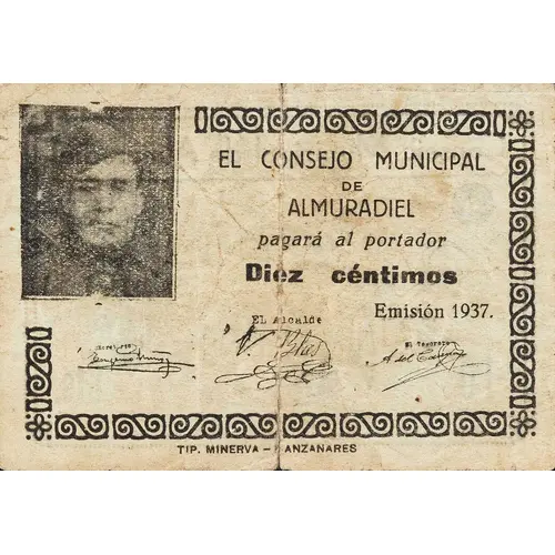 EL CONSEJO MUNICIPAL DE ALMURADIEL Pagará al portador Diez céntimos Emisión 1937. TIP. MINERVA - MANZANARES (Translation: The Municipal Council of Almuradiel Will pay the bearer Ten Centimos Issue 1937.) |