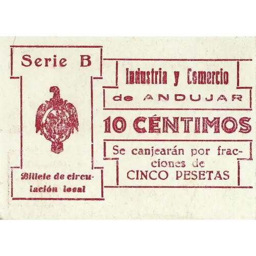 Industria y Comercio de ANDUJAR 10 CÉNTIMOS Se canjearán por fracciones de CINCO PESETAS Billete de circulación local (Translation: Industry and Commerce of Andujar 10 Centimos They will be exchanged for fractions of Five Pesetas Local circulation banknote) |