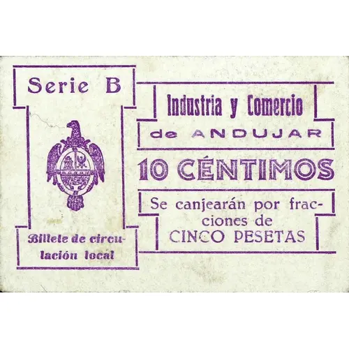 Industria y Comercio de ANDUJAR 10 CÉNTIMOS Se canjearán por fracciones de CINCO PESETAS Billete de circulación local (Translation: Industry and Commerce of Andujar 10 Centimos They will be exchanged for fractions of Five Pesetas Local circulation banknote) |