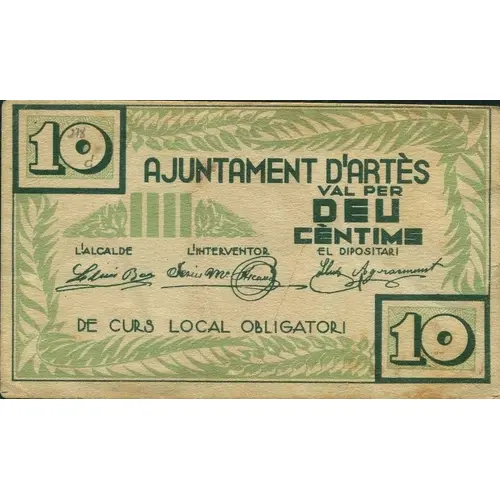 AJUNTAMENT D`ARTÉS 10 CÈNTIMS (Translation: City Council of Artés 10 Centimos) |