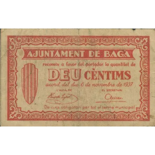 AJUNTAMENT DE BAGÀ reconeix a favor del portador la quantitat de DEU CÈNTIMS acord del dia 6 de novembre de 1937 De curs obligatori per tot el terme municipal (Translation: City Council of Bagà recognizes in favor of the bearer the amount of Ten Centimos agreement of November 6, 1937 Mandatory course throughout the municipality) |