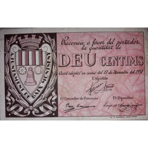AJUNTAMENT DE BAIX MONTSENY Reconeix a favor del portador la quantitat de DEU CENTIMS Acord adoptat en sessió del 17 de Novembre del 1937 (Translation: City Council of Baix Montseny Recognizes in favor of the bearer the amount of Ten Centimos Agreement adopted in session on November 17, 1937) |