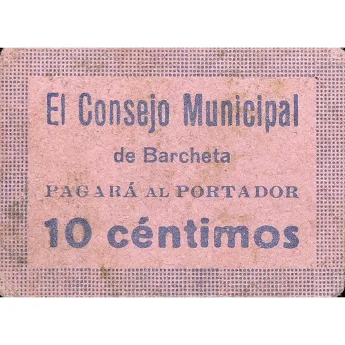 El Consejo Municipal de Barcheta PAGARÁ AL PORTADOR 10 céntimos (Translation: The Municipal Council of Barcheta Will pay the bearer 10 Centimos) |