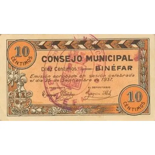 10 CÉNTIMOS CONSEJO MUNICIPAL BINÉFAR Diez Centimos Emisión aprobada en sesión celebrada el dia 25 de Septiembre de 1937. (Translation: Municipal Council of Binefar Ten Centimos Issue approved in session held on September 25, 1937.) |