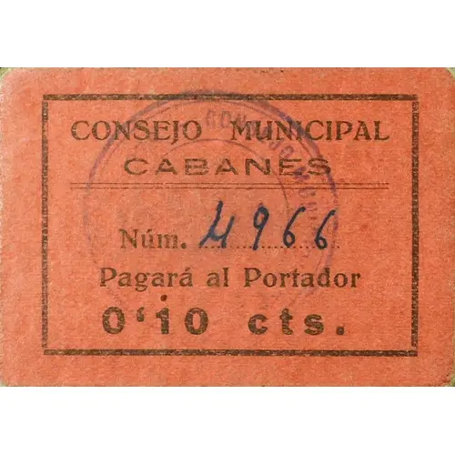 CONSEJO MUNICIPAL CABANES Pagará al Portador 0`10 cts. (Translation: Municipal Council Cabanes Will pay the bearer 0.10 Centimos) |