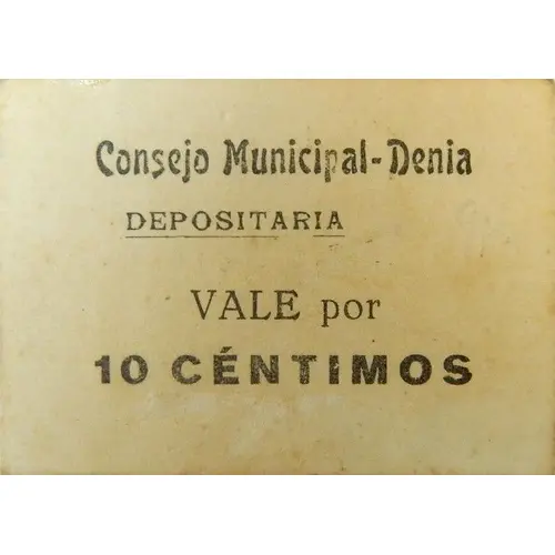 Consejo Municipal - Denia DEPOSITARIA VALE por 10 CÉNTIMOS (Translation: Municipal Council - Denia Depository Voucher for 10 Centimos) |