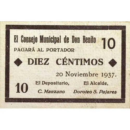 Obverse lettering 10 El Consejo Municipal de Don Benito PAGARÁ AL PORTADOR DIEZ CÉNTIMOS 20 Noviembre 1937.