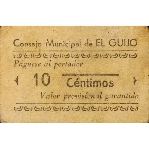 | Vorderseitenlegende | Consejo Municipal de EL GUIJO Páguese al portador 10 Céntimos Valor provisional garantido (Translation: Municipal Council of El Guijo Pay the bearer 10 Centimos Guaranteed provisional value) |