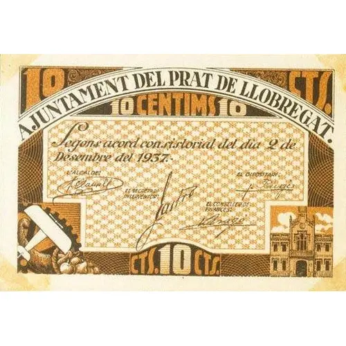 10 CTS. AJUNTAMENT DEL PRAT DE LLOBREGAT 10 CENTIMS 10 Segons acord consistorial del dia 2 de Desembre del 1937. (Translation: 10 Centimos City Council of El Prat de Llobregat 10 Centimos 10 According to council agreement of December 2, 1937.) |