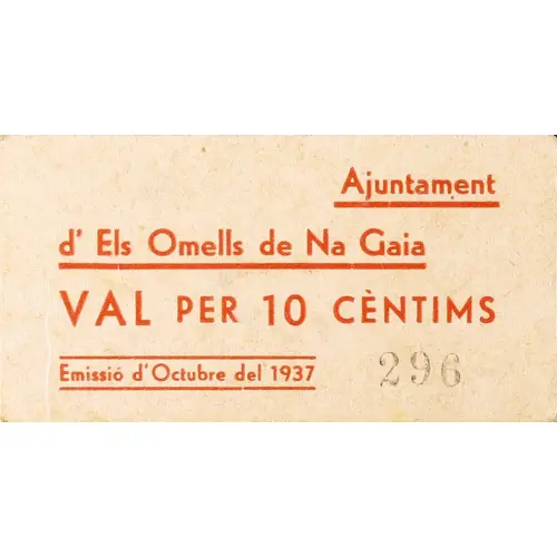 Ajuntament d`Els Omells de Na Gaia VAL PER 10 CÈNTIMS Emissió d`Octubre del 1937 (Translation: City Council of Els Omells de Na Gaia Voucher for 10 Centimos Issue of October 1937) |