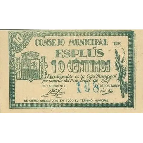 CONSEJO MUNICIPAL DE ESPLÚS 10 CÉNTIMOS Reintegrable en la Caja Municipal por acuerdo del 1º de Enero de 1937 DE CURSO OBLIGATORIO EN TODO EL TERMINO MUNICIPAL (Translation: Municipal Council of Esplus 10 Centimos Reimbursable in the Municipal Fund by agreement of January 1, 1937 Mandatory course throughout the Municipal term) |