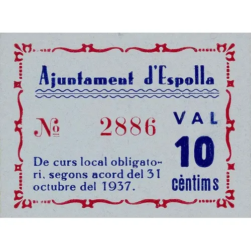 | Obverse lettering | Ajuntament d`Espolla VAL 10 cèntims De curs local obligatori, segons acord del 31 octubre del 1937. (Translation: City Council of Espolla Value 10 Centimos Mandatory local course, according to the agreement of October 31, 1937.) |