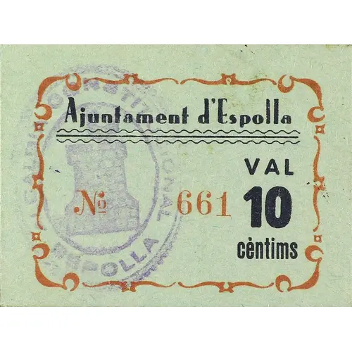 | Ön yüz lejandı | Ajuntament d`Espolla VAL 10 cèntims (Translation: City Council of Espolla Value 10 Centimos) |