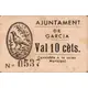 AJUNTAMENT DE GARCIA Val 10 cèts. Canviable a la caixa Municipal (Translation: City Council of Garcia It`s worth 10 Centimos Exchangeable at the Municipal savings Bank) |