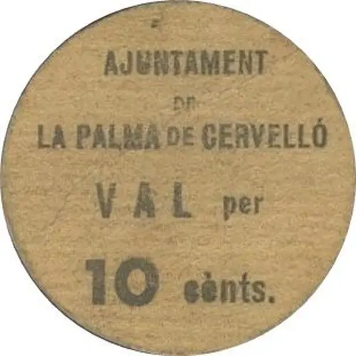 | 正面铭文 | AJUNTAMENT DE LA PALMA DE CERVELLO VAL per 10 cènts. (Translation: City Council of La Palma de Cervelló Valid for 10 Centimos) |