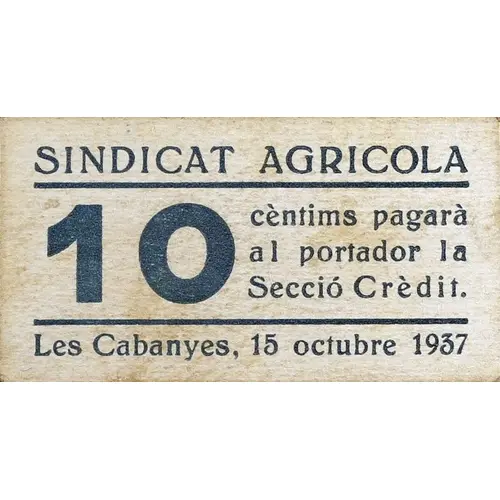 | Obverse lettering | SINDICAT AGRICOLA 10 cèntims pagarà al portador la Secció Crèdit. Les Cabanyes, 15 octubre 1937 (Translation: Agricultural Union 10 Centimos will be paid to the bearer by the Credit Section. Les Cabanyes, October 15, 1937) |