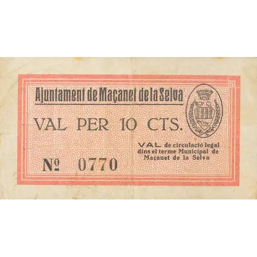 (Translation: City Council of Maçanet de la Selva Valid for 10 Centimos Voucher of legal circulation within the municipality of Maçanet de la Selva)