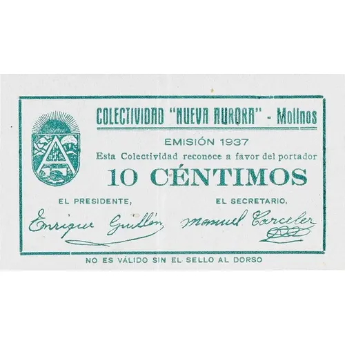 COLECTIVIDAD `NUEVA AURORA` - Molinos EMISIÓN 1937 Esta Colectividad reconoce a favor del portador 10 CÉNTIMOS NO ES VÁLIDO SIN EL SELLO AL DORSO (Translation: Collectivity `Nueva Aurora` - Molinos Issue 1937 This Collectivity recognizes in favor of the bearer 10 Centimos Not valid without stamp on back) |