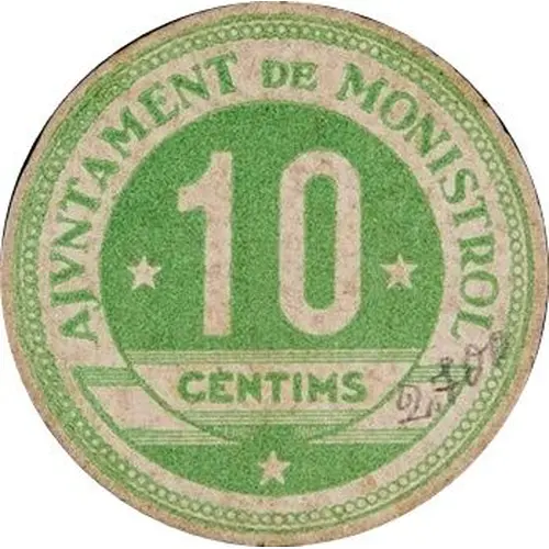 | Obverse lettering | AJUNTAMENT DE MONISTROL 10 CÈNTIMS (Translation: City Council of Monistrol 10 Centimos) |