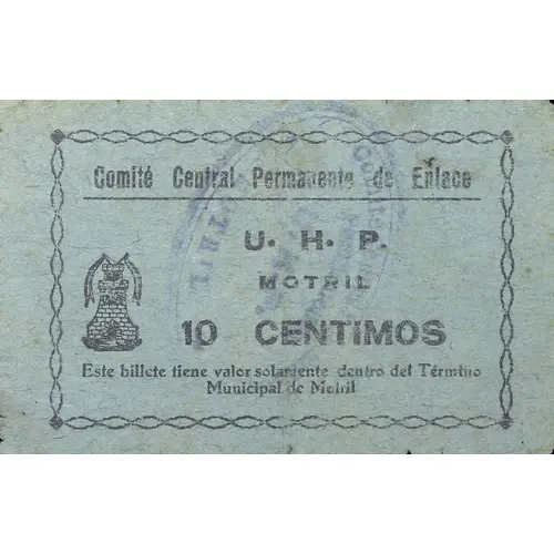 Comité Central Permanente de Enlace U. H. P. MOTRIL 10 CENTIMOS Este billete tiene valor solamente dentro del Término Municipal de Motril (Translation: Permanent Central Liaison Committee U.H.P. Motril 10 Centimos This banknote has value only within the Municipal Term of Motril) |