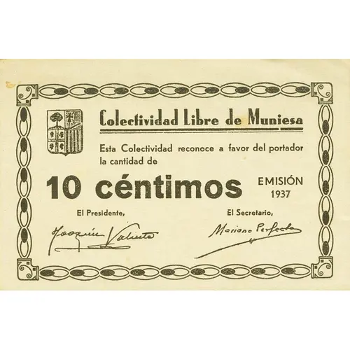 (Translation: Free Collectivity of Muniesa This Collectivity recognizes in favor of the bearer the amount of 10 Centimos Issue 1937)