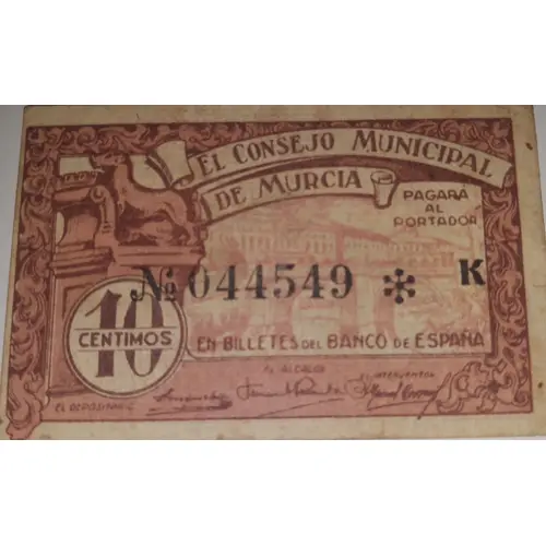 EL CONSEJO MUNICIPAL DE MURCIA PAGARA AL PORTADOR 10 CENTIMOS EN BILLETES DEL BANCO DE ESPAÑA (Translation: The Municipal Council of Murcia Will pay the bearer 10 Centimos In banknotes of the Bank of Spain) |