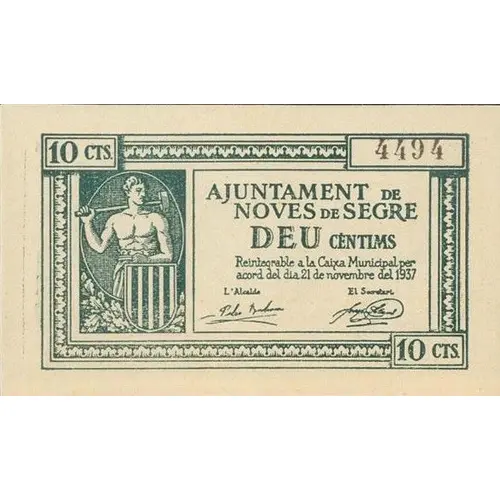 10 CTS. AJUNTAMENT DE NOVES DE SEGRE DEU CÈNTIMS Reintegrable a la Caixa Municipal per acord del dia 21 de novembre del 1937 (Translation: 10 Centimos City Council of Noves de Segre Ten Centimos Refundable to the `Caixa Municipal` by agreement of November 21, 1937) |